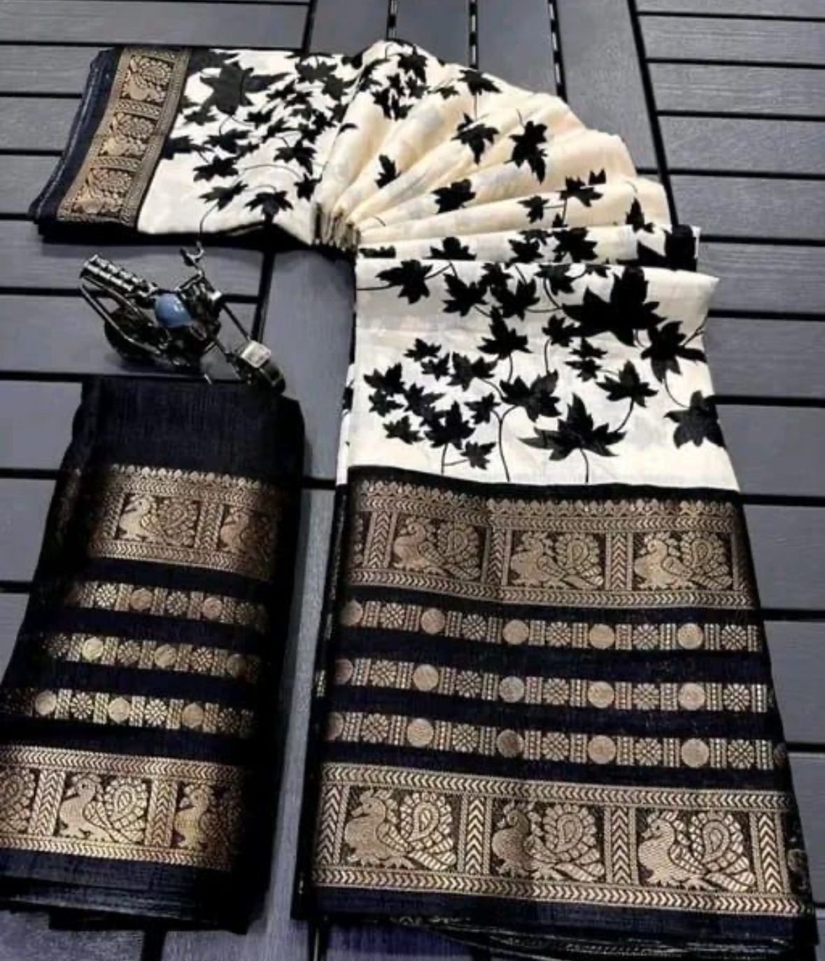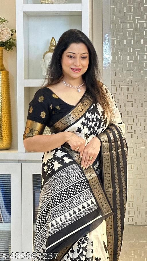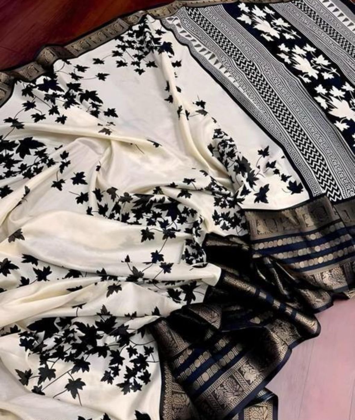 Elevate your ethnic style with this luxurious Dola Silk saree, featuring elegant black and white maple leaf and floral prints, a jacquard woven border, and a contrasting blouse piece. Crafted from premium Dola silk yarn for a soft, smooth feel.