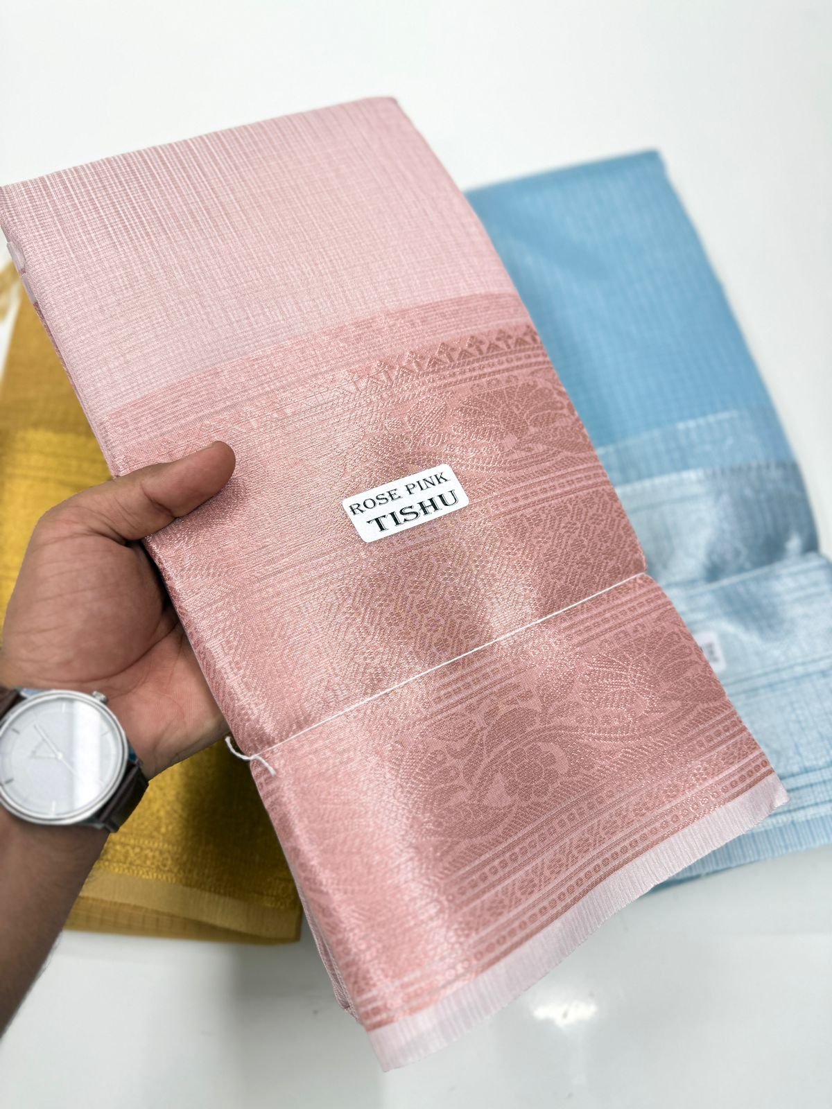 Elegant and lightweight rose Rose Pink tissue saree with a soft shimmer—perfect for festive occasions, parties, or special events.
